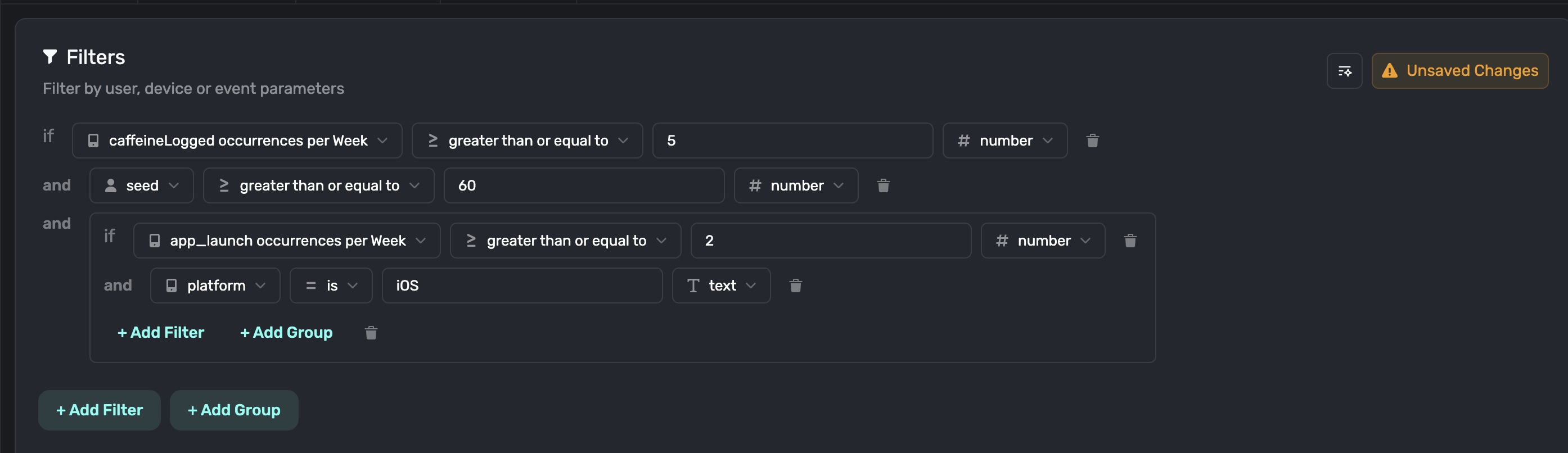 Event count filters are a powerful way to target users based on the number of times they've performed an action or fired a placement. In this example, we would target users who have triggered the caffeineLogged placement at least 3 times in the last week: